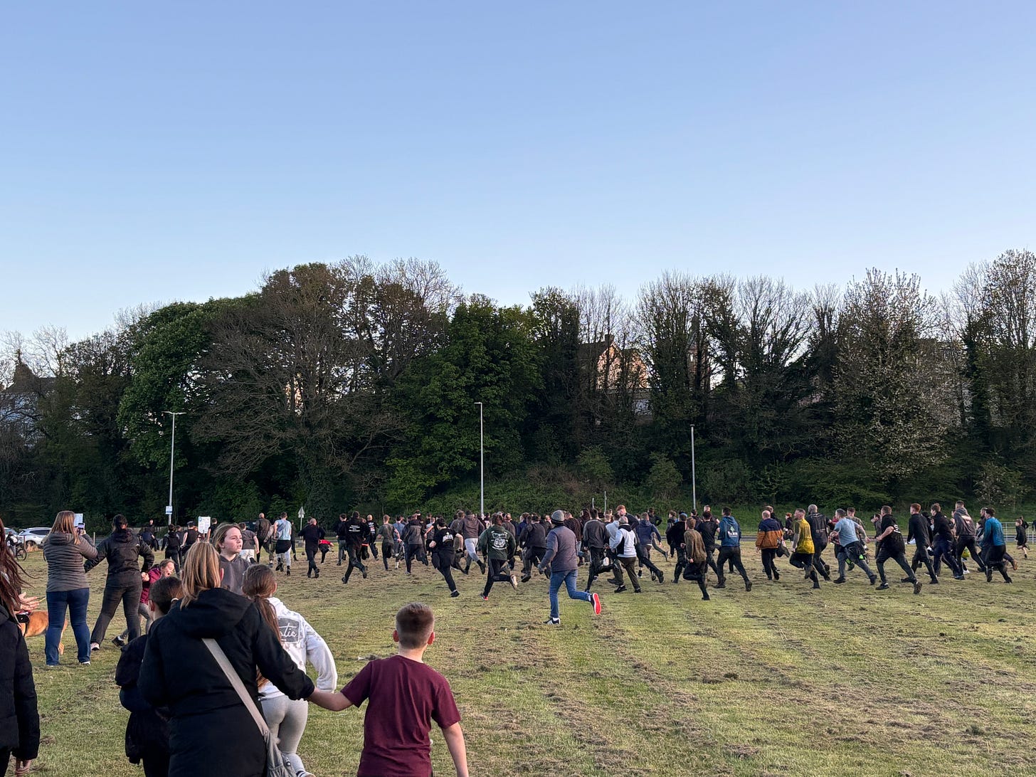 The game stays here for fifteen or twenty minutes. There isn’t much to see. After the wild surge of movement, attention now fragments. The scrum at the centre is surrounded by people with cameras, people waiting to step in, but further out at the edges are mums with prams, and children doing TikTok dances, and teenagers snapping branches off trees, and a lad collecting the litter that such a gathering creates. At the edge of the commotion, not everyone is watching or able to see what’s going on, but it’s clear that it’s enough to be in orbit of the ball. That’s what draws people out, draws people together.