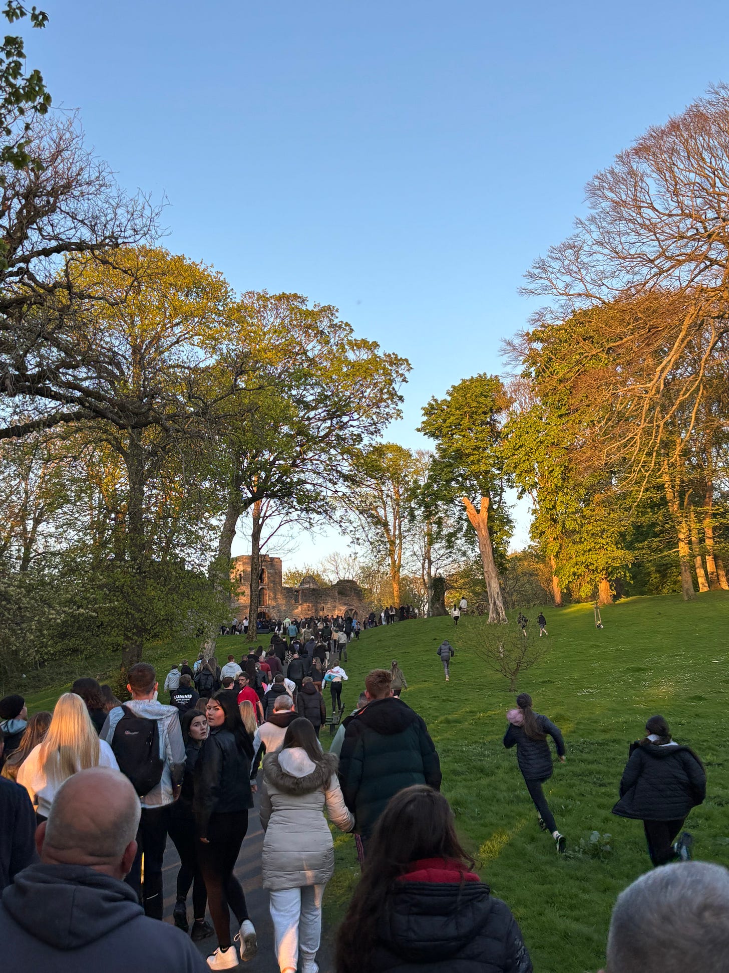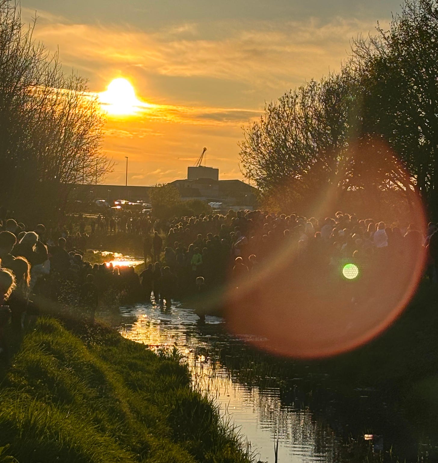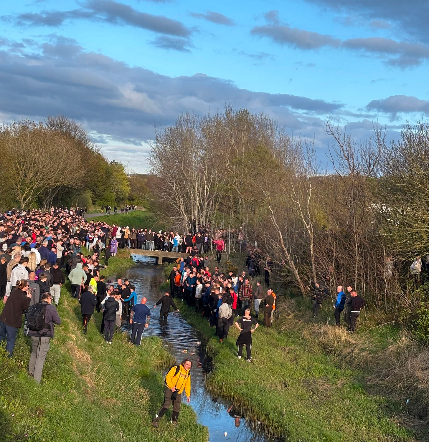 We fill in until both sides of the beck are full, until people are spilling out onto the footpaths, until children are scrambling up into the trees. In the car park, an ice cream van makes a killing, and fluorescent PCSOs cluster in pairs or fours with their hands tucked into their stab-proof vests. More and more people arrive. Some lads scatter down the grassy embankment, try to ford the beck to join friends, but the water runs knee deep and they back away. It’s not yet time.